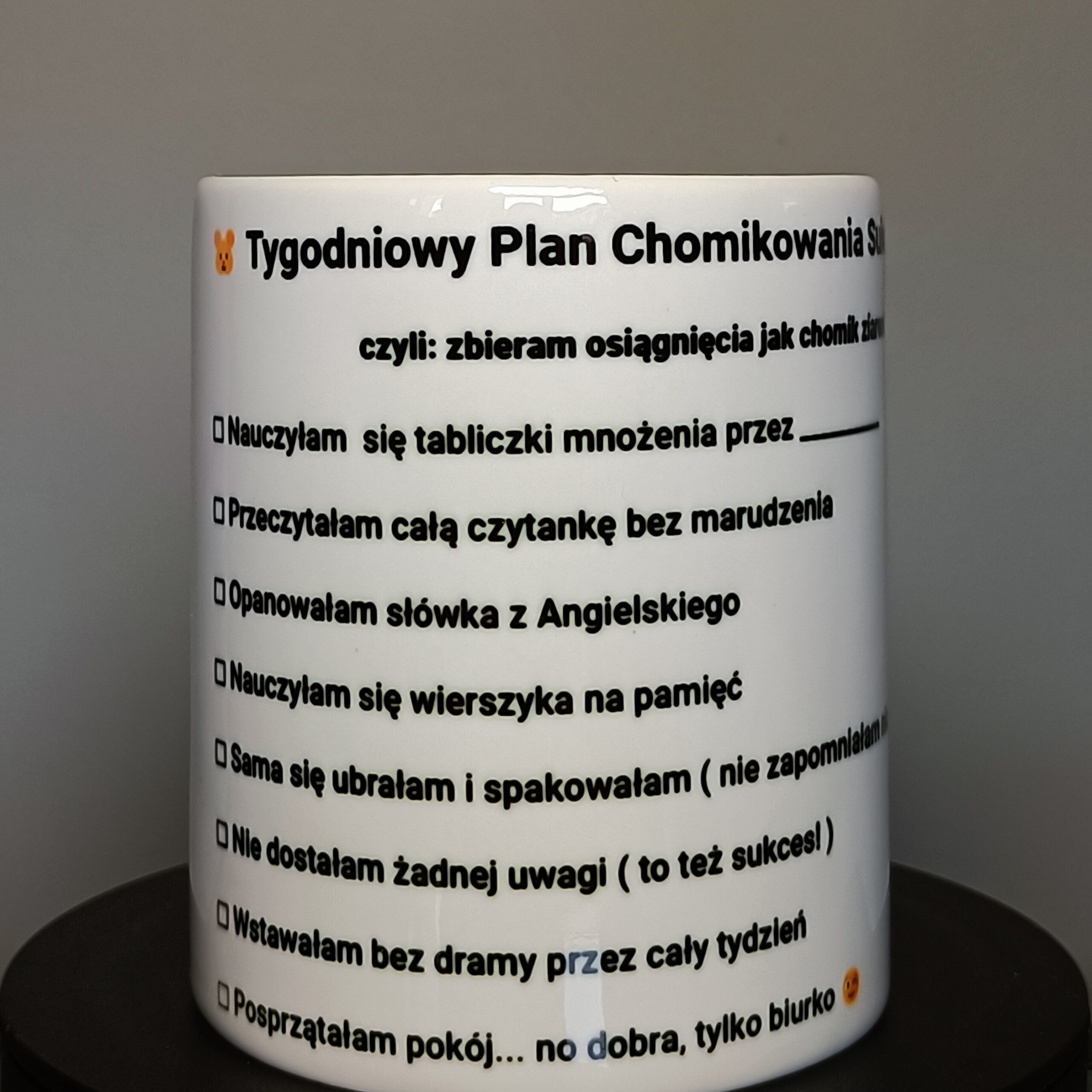 Bezpośrednio na skarbonce nadrukowana jest tygodniowa checklista, dzięki której dziecko może codziennie zaznaczać swoje szkolne sukcesy takie jak: